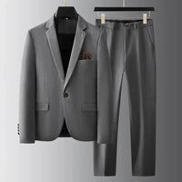 This men’s 2-piece suit set includes a single-breasted blazer and matching straight-leg trousers. The blazer features a notched lapel, two front flap pockets, and a welt chest pocket with a pocket square. It has a visible button closure and long sleeves with button details at the cuffs. The trousers have a waistband with belt loops, a front button-and-zip fastening, and side pockets.
