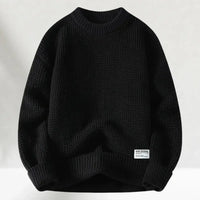 This men’s jumper features a crew neck with a ribbed finish. The surface has a textured knitted pattern that extends across the body and sleeves. The cuffs and hem are ribbed, creating a defined edge. A small rectangular label is sewn near the hem on one side.