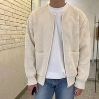 Men's Minimalist Zip-Up Cardigan with Round Neck and Ribbed Knit