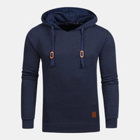 This men’s pullover hoodie features an all-over textured surface arranged in a small block pattern. It has a hood with long drawstrings and a straight hem. The sleeves are full length with a fitted shape that tapers toward the wrists. A small stitched patch is visible near the hem on one side, adding a subtle detail to the design.