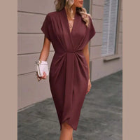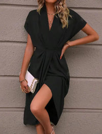 This women’s midi dress features short sleeves with a wide, draped shape. The front has a deep V-neckline created by overlapping fabric. A gathered drape detail is placed at the waist, extending down the front of the skirt. The skirt includes a visible side slit that opens above the knee. The hemline falls to a midi length.